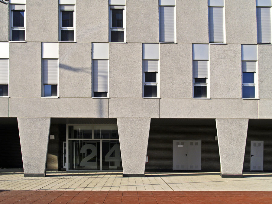 El diseño de los edificios se concreta en volumetrías prismáticas de planos continuos formalizados mediante un damero de piezas prefabricadas de hormigón tintado en color gris, con huecos similares rasgados de forjado a forjado, en una seriación asimétrica, y los planos que forman la volumetría del edificio se apoyan en la rasante de la parcela mediante piezas trapezoidales.