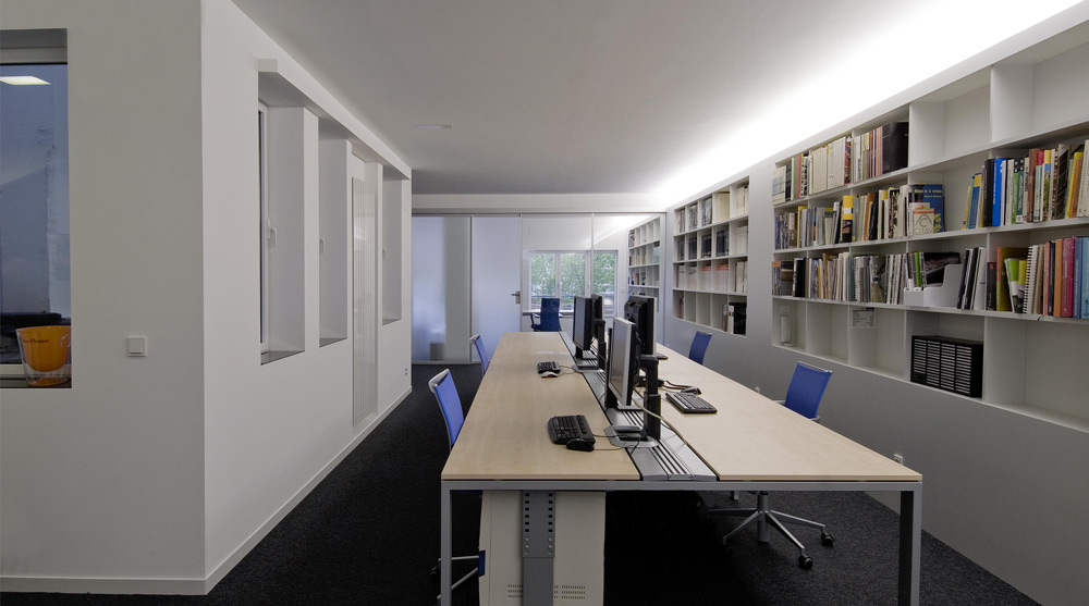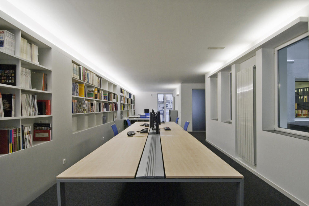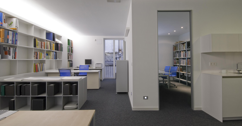El espacio se ordena mediante una biblioteca lineal apoyada en la medianera, que recorre el fondo edificatorio, de manera que la totalidad del espacio es diáfano, separando únicamente el despacho-sala de reuniones con una mampara de vidrio transparente; desde el fondo del local se puede observar el arbolado de la Plaza de los Fueros y se consiguen vistas cruzadas a través del patio interior haciendo que éste forme parte del conjunto.