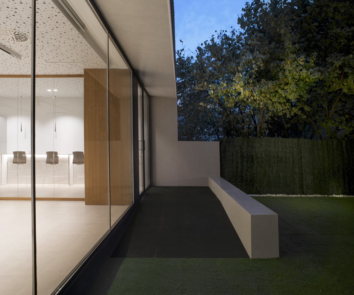 Se pone en valor el patio interior, hasta ahora sin utilidad, con una fachada muy acristalada, con tratamientos vegetales y una escultura de Koko Rico de fondo sobre el muro de hormigón que limita el espacio.