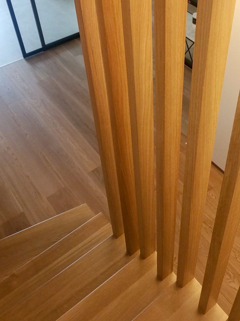 Los criterios para la rehabilitación de la vivienda, en una distribución modificada de la original, son los de respetar los elementos exteriores, para lo que se rehabilitan y actualizan las carpinterías de pino oregón, sustituyendo algunas de ellas con idéntico diseño, y se mantiene y rehabilita la galería original que hace de colchón térmico en la orientación este.