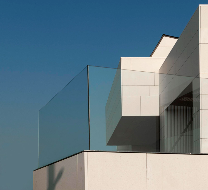 El edificio está revestido de piedra caliza blanca y el zinc pre patinado en color negro, en las volumetrías inclinadas.