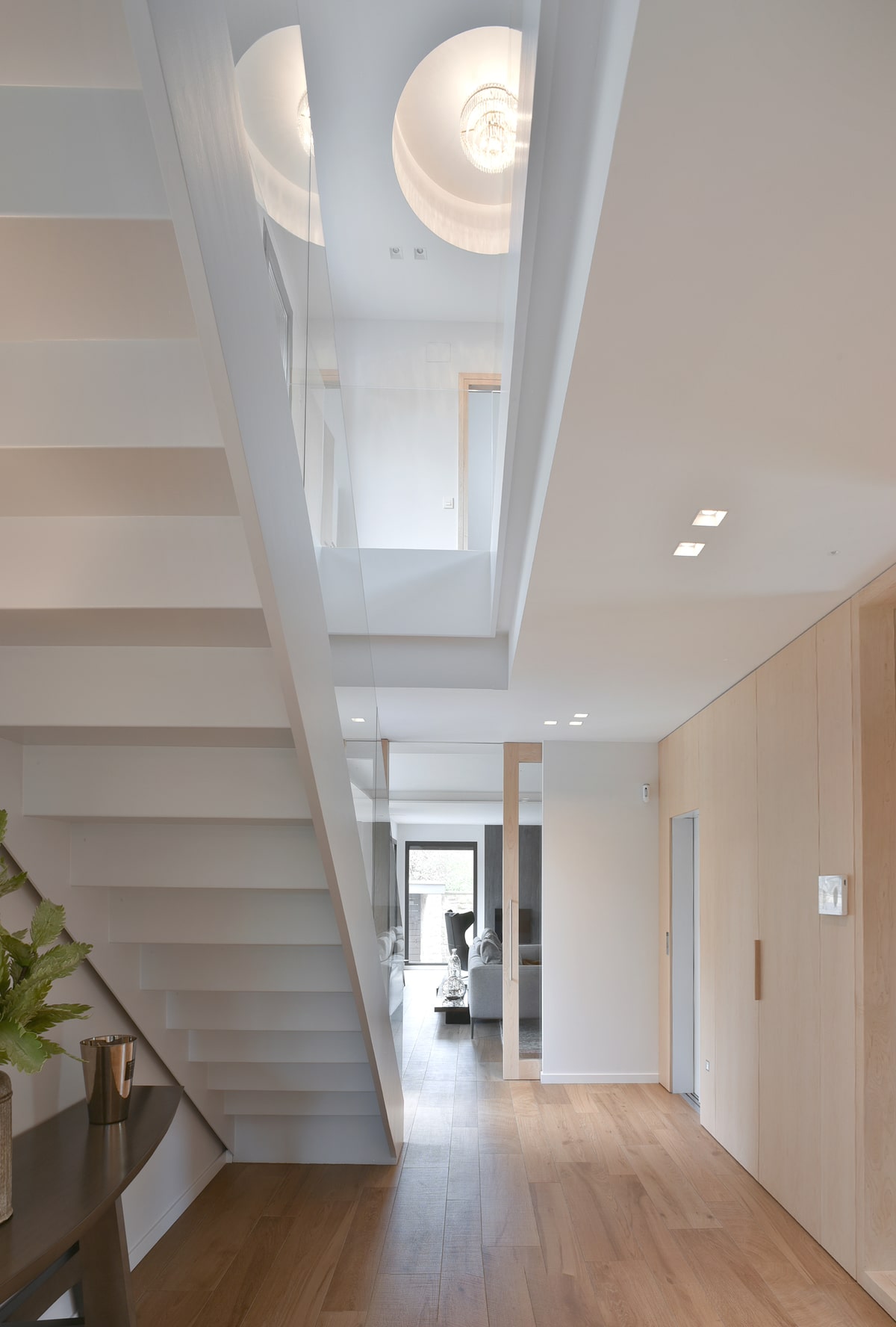 En la planta baja se desarrolla el programa de día. Acceso central por la fachada Noroeste al espacio de comunicación de las dos plantas mediante una escalera lineal y un ascensor, además de un aseo de cortesía. Amplio estar con varias zonas de estancia y al lado opuesto el comedor y la cocina. Todos los espacios se orientan al mediodía. Desde el oficio situado junto a la cocina, al Norte del edificio, se conecta con el garaje y las instalaciones.