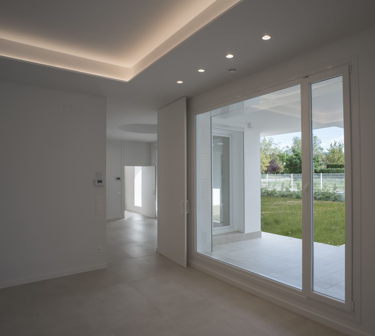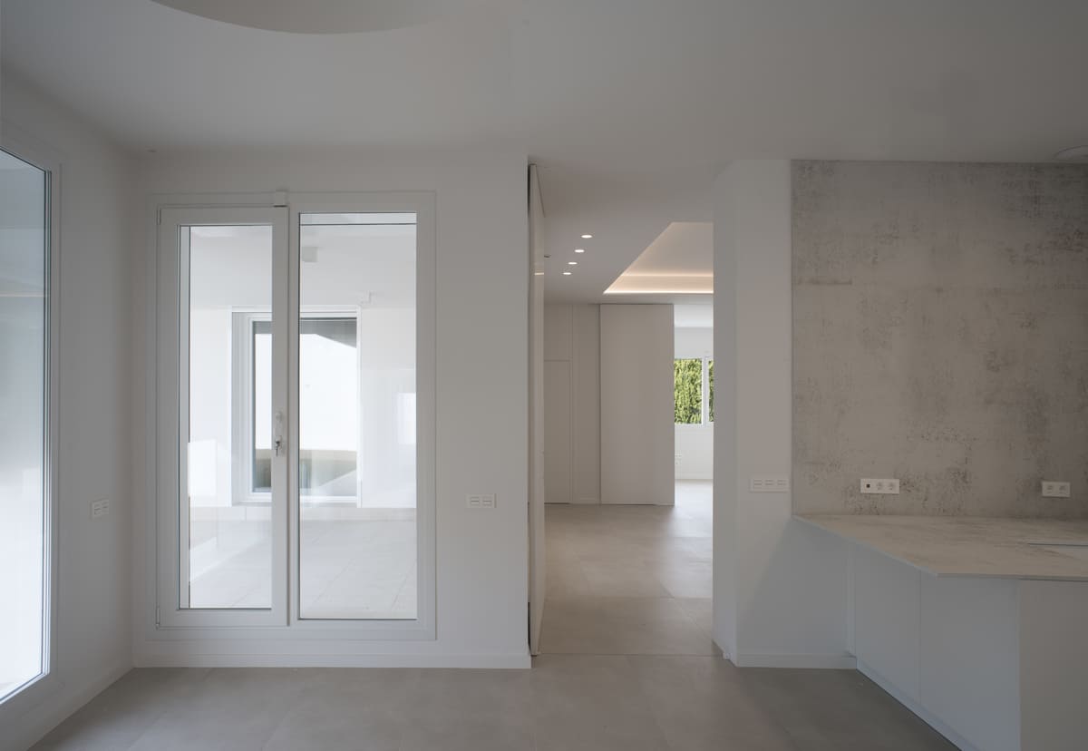 El material de revestimiento es el mortero de cal de color blanco en varias capas, sobre muros de carga de termoarcilla, y carpintería de pvc en color blanco.